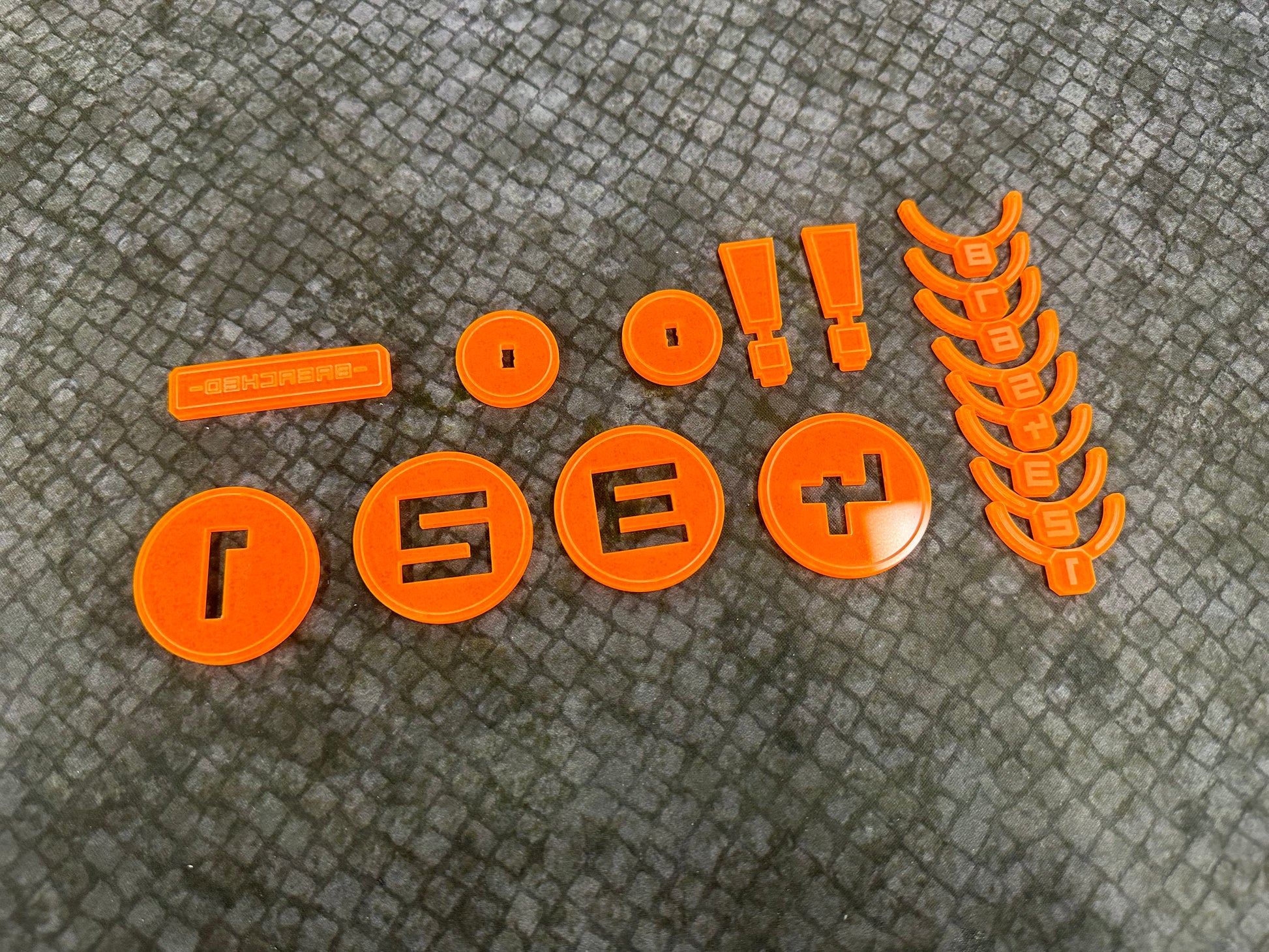 This set includes 8 numbered base markers, 8 ! mark 25mm tokens, a breach token, and 4 40mm Hardpoints.